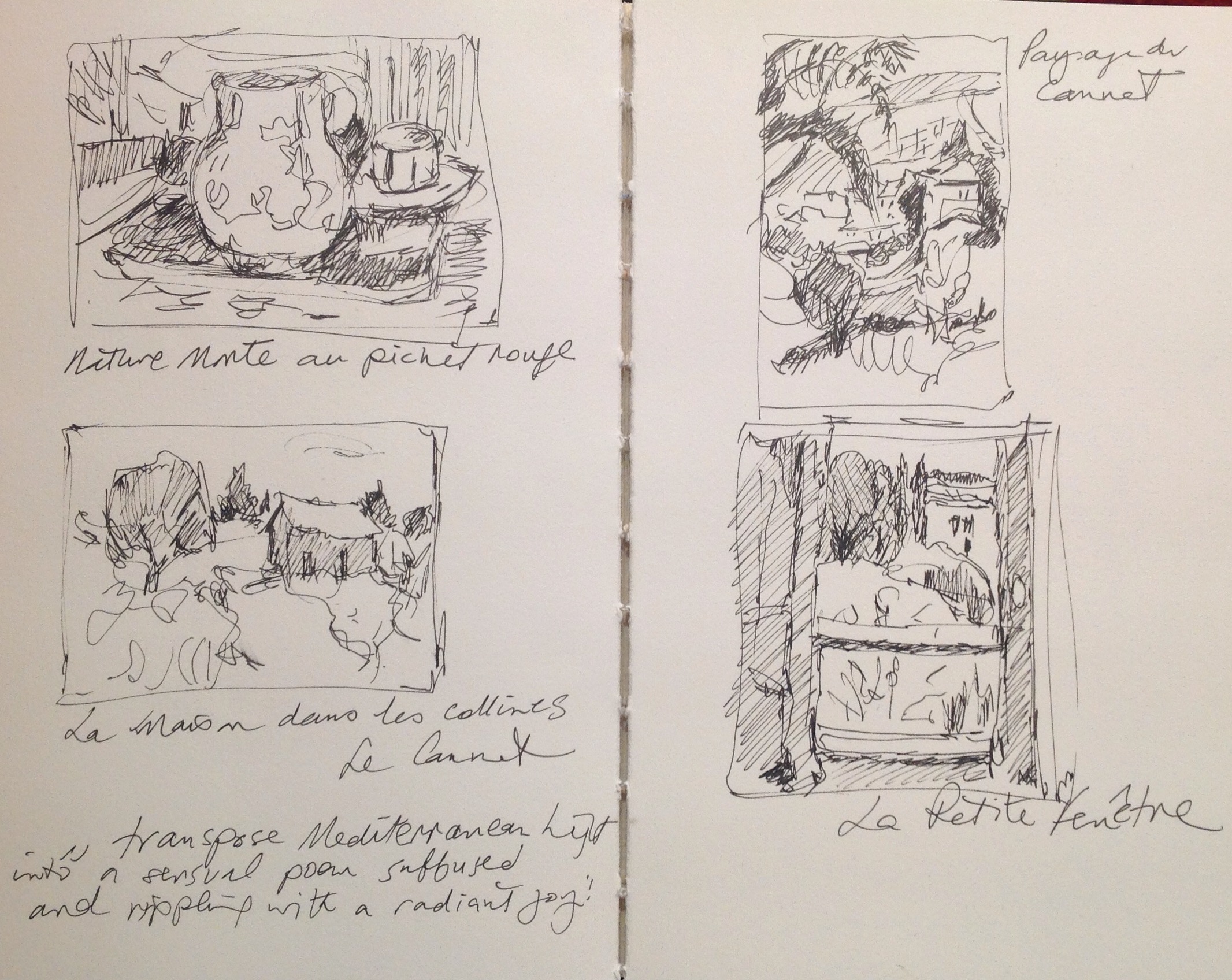 Our afternoon is spent in the Musée Bonnard, sketching the beautiful paintings and drawings of Bonnard, an artist who shone a transcendent light onto the intimate and ordinary passage of daily life. Almond trees in Spring, gardens, windows and breakfast tables, and tender studies of his beloved Marthe through the years. The simplicity and fluid ease of his drawings gives us a glimpse of how natural and effortless it could be. In his notebook he wrote about his morning walks – “Maris çela fait vivre” – “it brings you alive”. An art critic wrote of Bonnard’s paintings: The artist transposes Mediterranean light into a sensual poem suffused with a radiant joy.  It was a joy to be there.