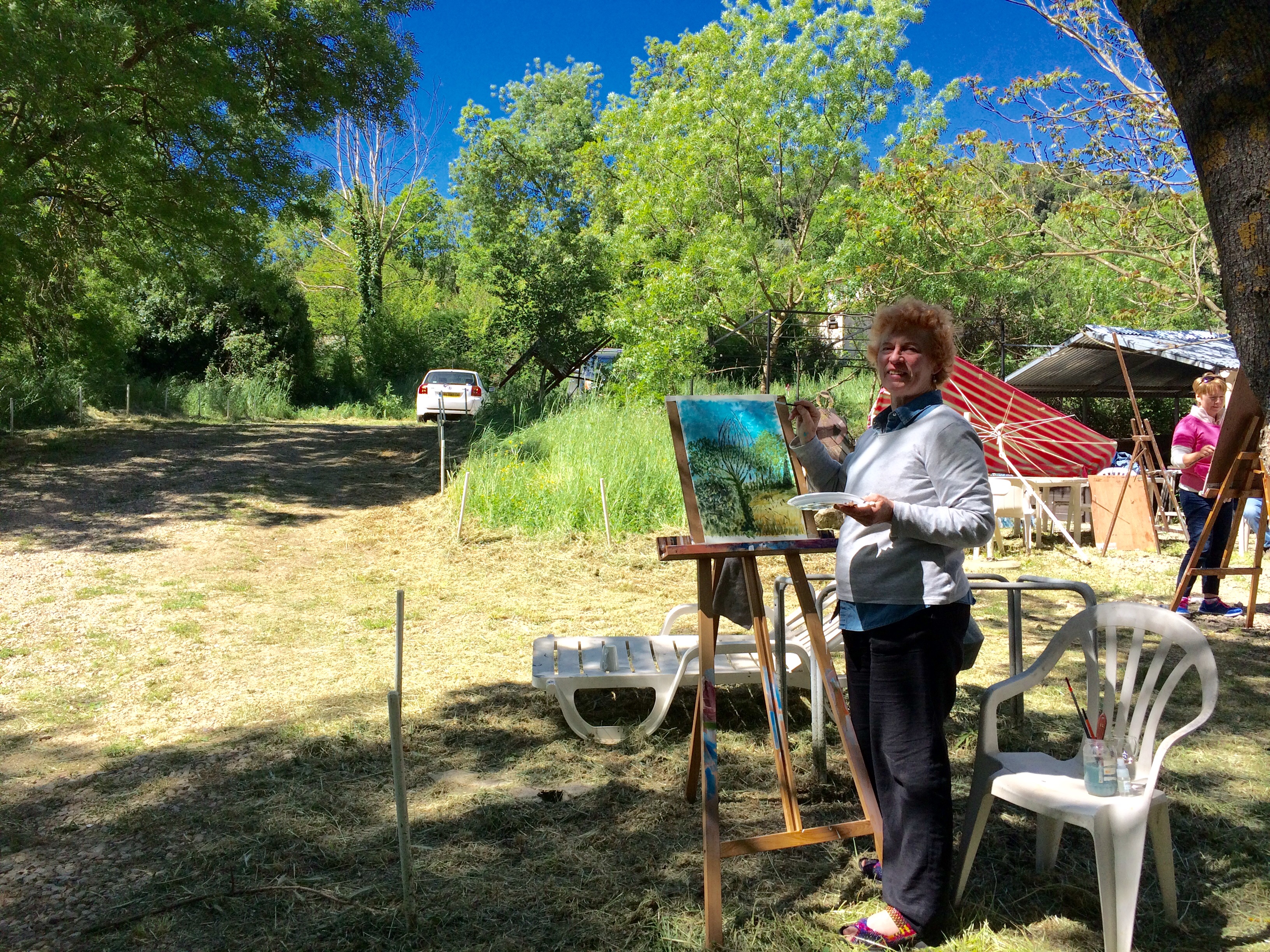 Day 2 – a whole day painting with the Hangar Art Association, near Châteauneuf de Grasse, where I had been a member and instructor during our time in France. For our Irish artists, a “French style” art workshop is a special experience – in the sunshine, under the trees, with a glass of rosé in hand to inspire creative flow!