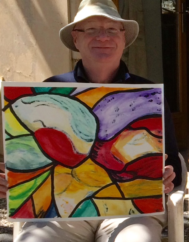 Dutch abstract artist Pim de Jongh leads an international gathering of artists here every Wednesday in a relaxed and informal setting. We are visitors today, warmly welcomed by all. Using acrylics on paper, we can transform our sketches into a larger format, or simply paint the scene before us, tall grass waving in the wind, cypress trees against the skyline, a bright canopy of green leaves overhead.