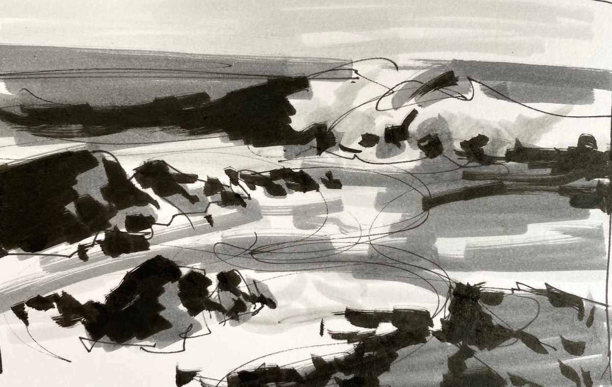 I carry a selection of waterproof pens in sizes from 0.1 to 0.5. Widely available in art or stationary stores such as Easons. There are several brands – Pitt, Micron, Staedtler, Unipin, and some are available as a set of 3 or 5 pens – just check that it says “waterproof”, so the ink won’t run when you apply watercolour on top.