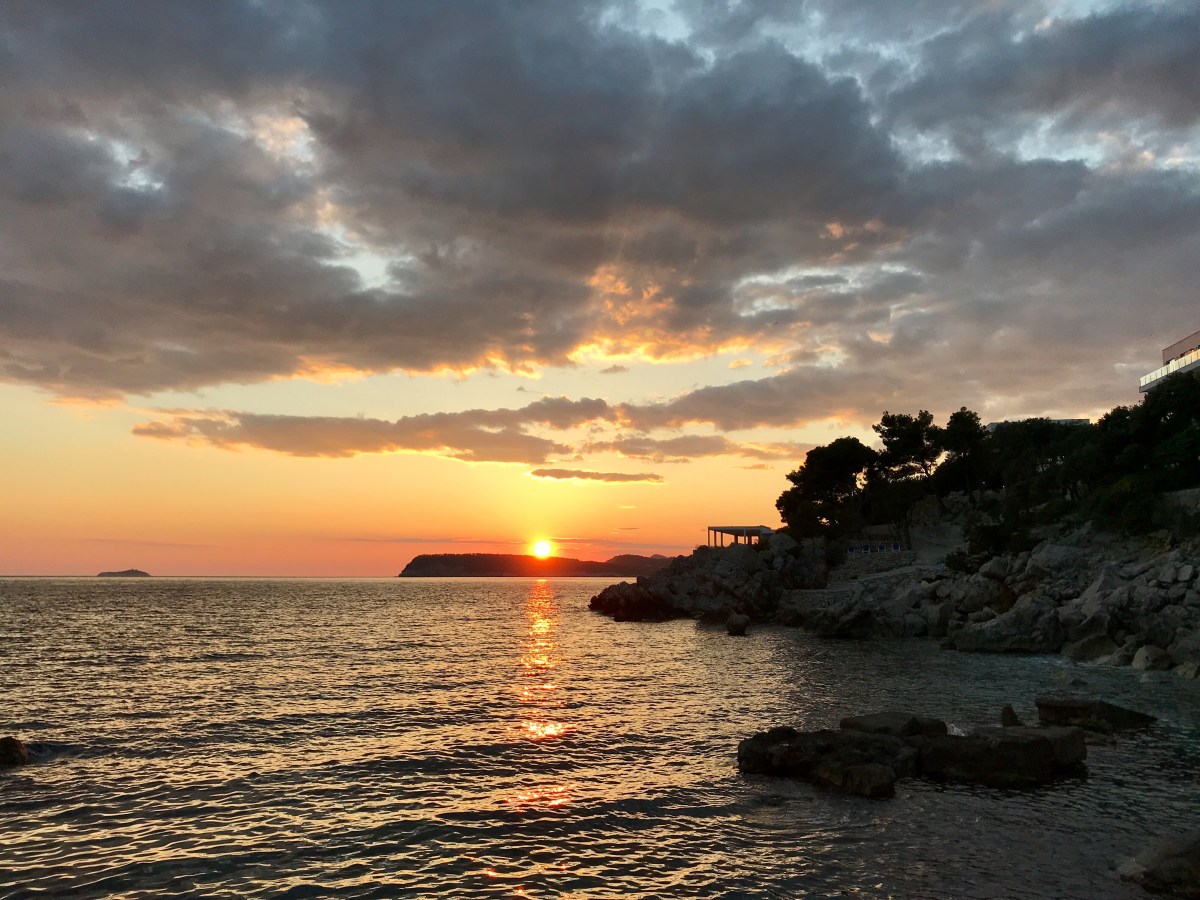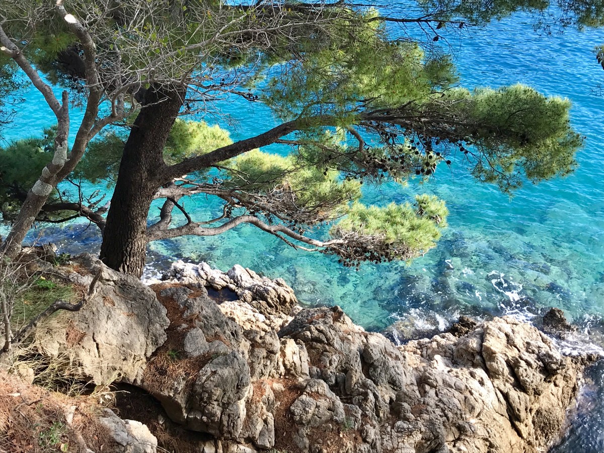 “Adriatic Coast at Babin Kuk below Levanat Restaurant after delicious lunch of Mozzarella Gratinée with crisp white Croatian Sauvignon Blanc. After passing clouds the sun shines a steady stream. The rocks glisten gold in the warm early Spring sunshine. The waves wash softly ashore – a shaft of bright green, inky depths and sparkling trails of foam”