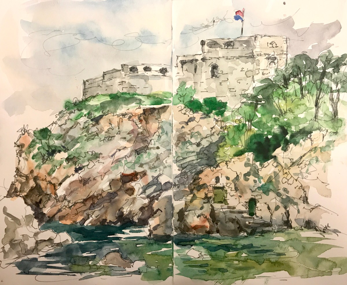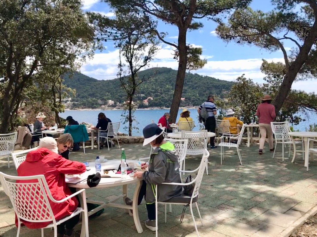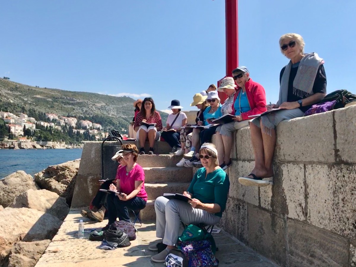 Wonderful week with our group of artists in April, sketching and painting the historic city of Dubrovnik and the beautiful Adriatic coast of Croatia. We had joined the Travel Department “Discover Dubrovnik” tour, staying in the lovely Valamar Tirena Hotel outside the city by the sea. This was our perfect base, quiet and peaceful, yet a very short distance by bus from the Old Town. April weather was cool and sunny, and we enjoyed strolling and sketching the city before the Summer crowds arrived.