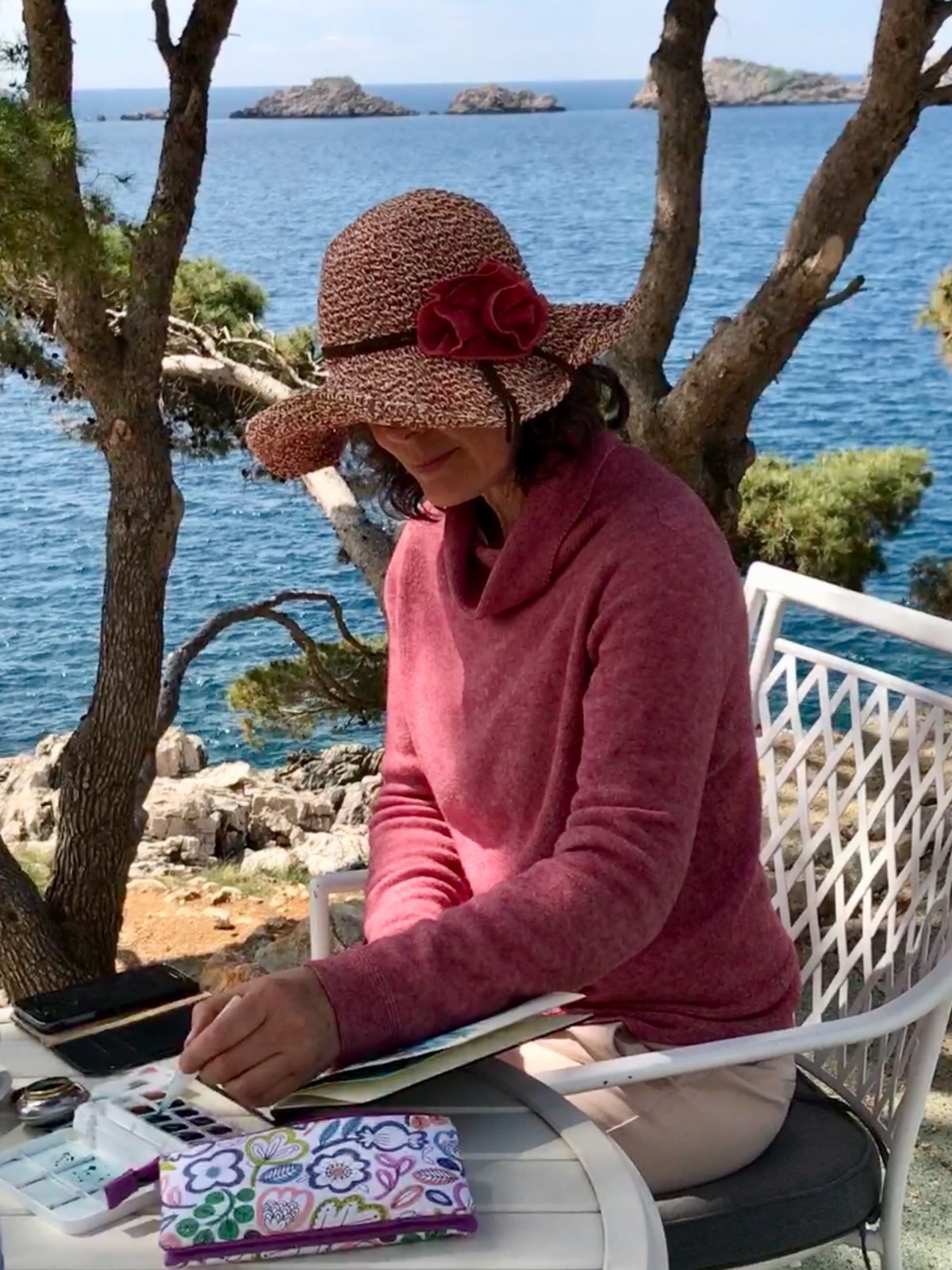 Across the harbour, a beautiful vista of sea, coastline and islands, sketching in the sun while boats sailed past