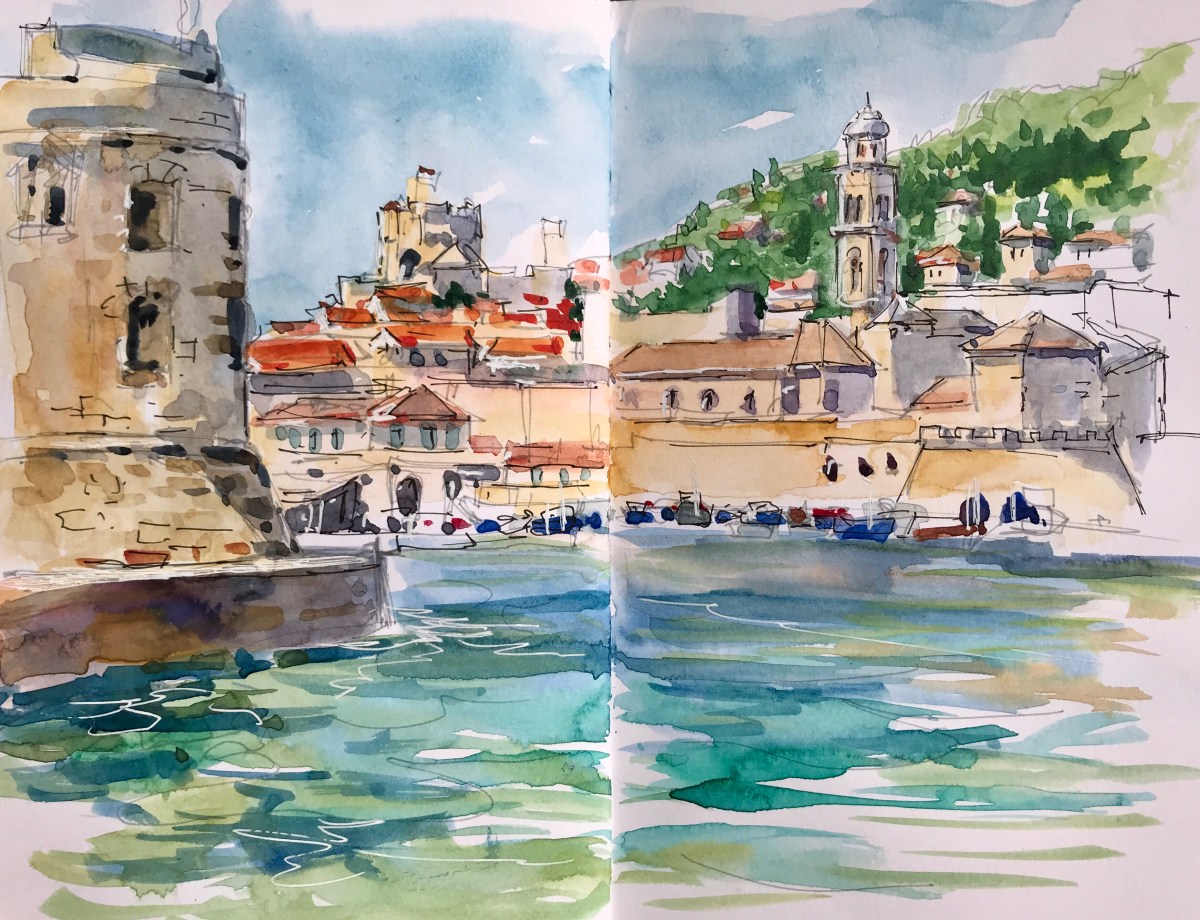 Our local guide Suzanna brought the group on a guided walking tour of the Old Town to get our bearings, pointing out scenic locations to stop and sketch. After a wonderful lunch in the Bistro Revelin overlooking the Old Port, we stayed to paint the view across the harbour of the cathedral and city skyline.
