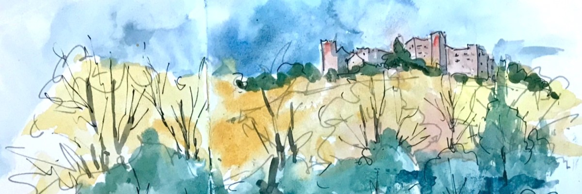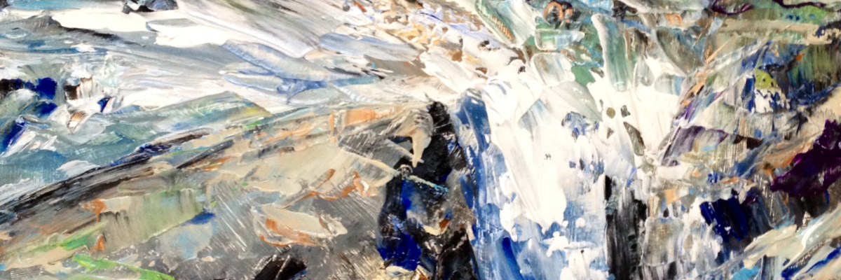 After torrential rainstorms on Tuesday, today is bright and clear, and the roads open after flooding and fallen trees. The river at Gorges du Loup is a swollen torrent of rushing foam. I’m the only person there, drenched in the spray. This is my favourite subject to paint, the crash and clash of water on rock, fluid motion meeting solid mass. At home I start a quick study in acrylic, wanting to catch some of the energy and drama of the original scene. My first marks are a simple outline of the main shapes, focusing on the dynamic pattern of…