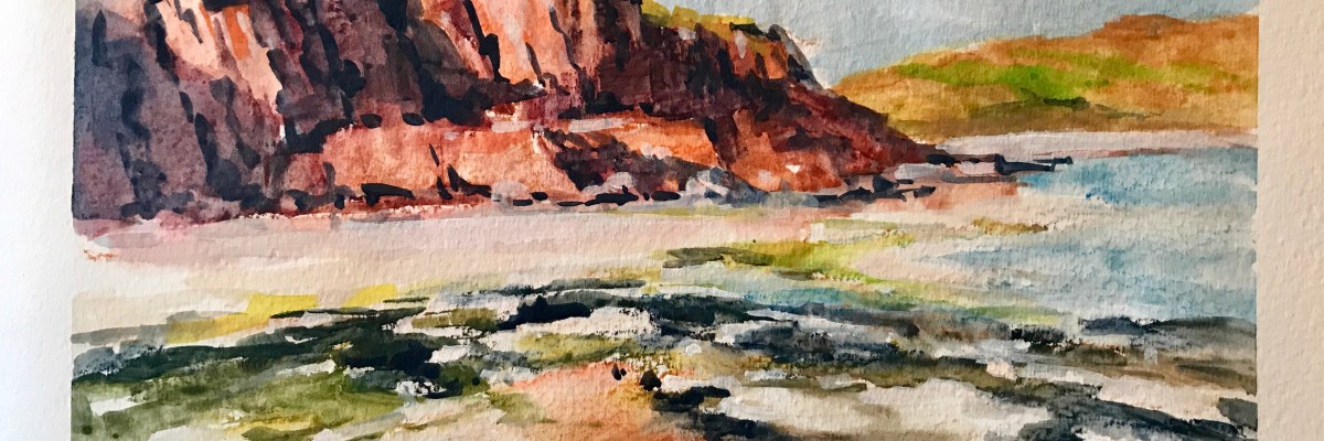 My painting process starts with some sketches to consider my composition, study my subject and refine my ideas about what I want to express. “Strand at Sunset, Dunmore East” focuses on the drama of the warm evening light on the cliff face, the deep shadow patterns, and the directional force of the tide pools and banks of seaweed, drawing the eye into the distance. The light is changing fast, so I start with a reference photo A quick sketch in pen and ink allows me to study the rock strata and the shapes of the seaweed masses And a “notan”…