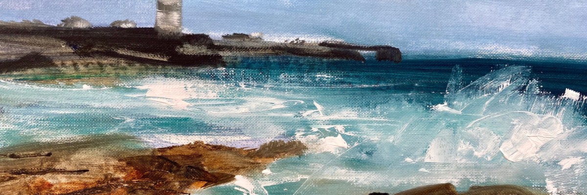 Winter has arrived on the Côte d’Azur. Grey skies and a damp chill in the air. For the first time this year I’ve moved my easel indoors from the terrace to the comfort of a warm room, music playing, mugs of ginger tea on hand and mince pies in the oven. My painting matches the mood of the season, a muted palette of soft grey tones. A few strokes of oil pastel on the surface of the acrylic painting enliven the distant glitter on the sea, the sunlit edge of the cloud, the golden light of the cresting wave. A…